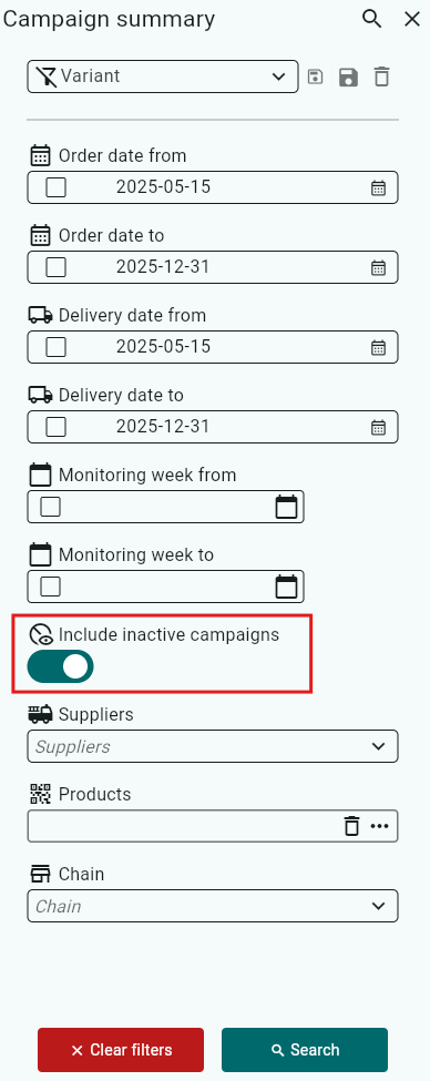 If you also want to see inactive campaigns, check that option before clicking Search.
