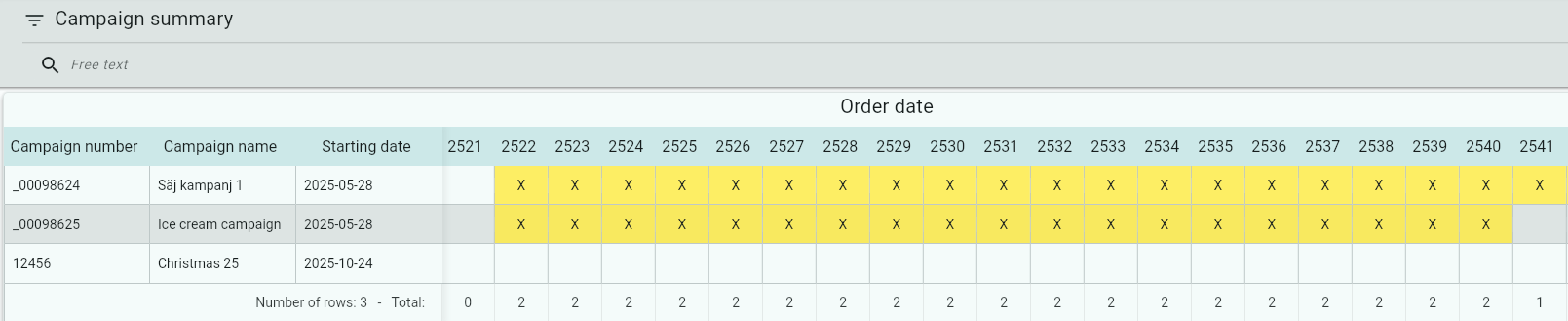 If there is a yellow X under the weeks, it means the campaign was created with dates that extend across those weeks.