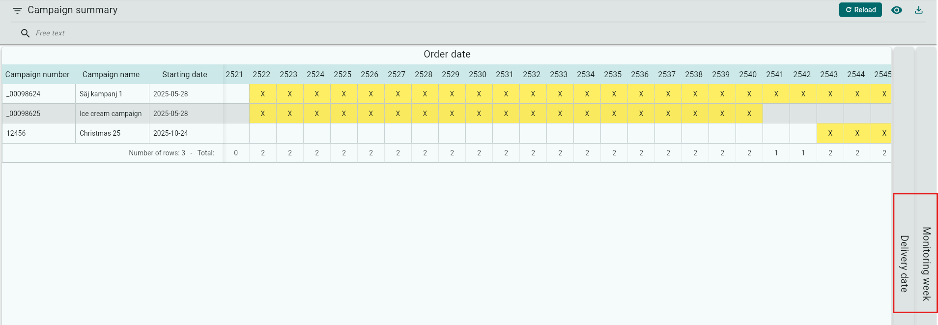 If you instead want to see an overview of campaigns based on Delivery Date or Follow-up Week, you can do so by clicking the corresponding tab on the far right.