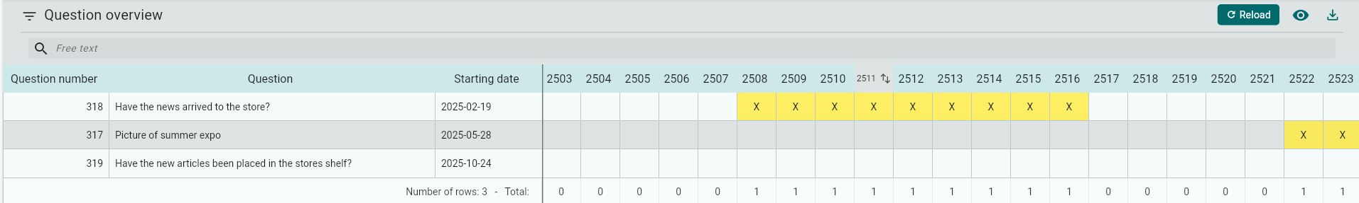 If the market question has an X in one of the week boxes, it means the question is active that week, meaning the sales representatives should be able to see it for the customers linked to that question during that week.