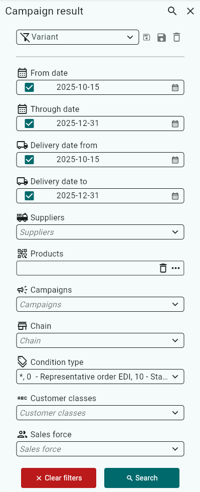 You can filter your search by, for example, Campaigns, Sales Force, Delivery Date, and Chain.
