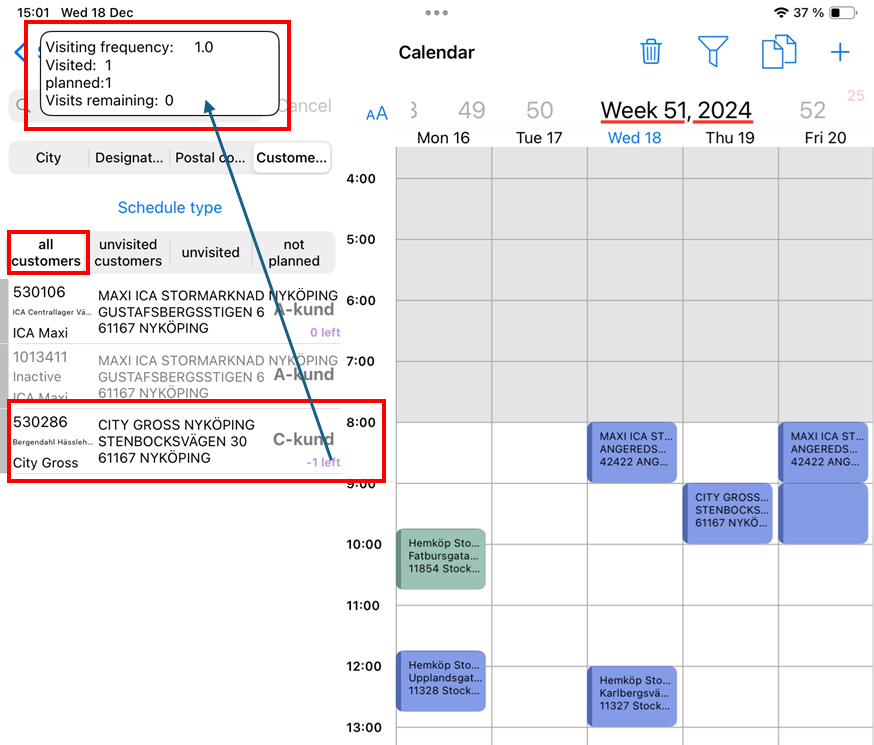 In the example below, the customer has a visit frequency of 1 and 1 visit made, which results in 0 remaining visits. This customer is only shown in the “All Customers” tab because the store has received its visit and is planned. The reason this customer is shown as -1 remaining visits is because the store was visited on a day it was not planned for. By clicking on -1 remaining, it is confirmed that the customer has received the correct number of visits according to the frequency.