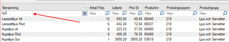 Vi skriver Ljus i kolumn benämning. Då visas endast produkter med Ljus någonstans i benämningen.