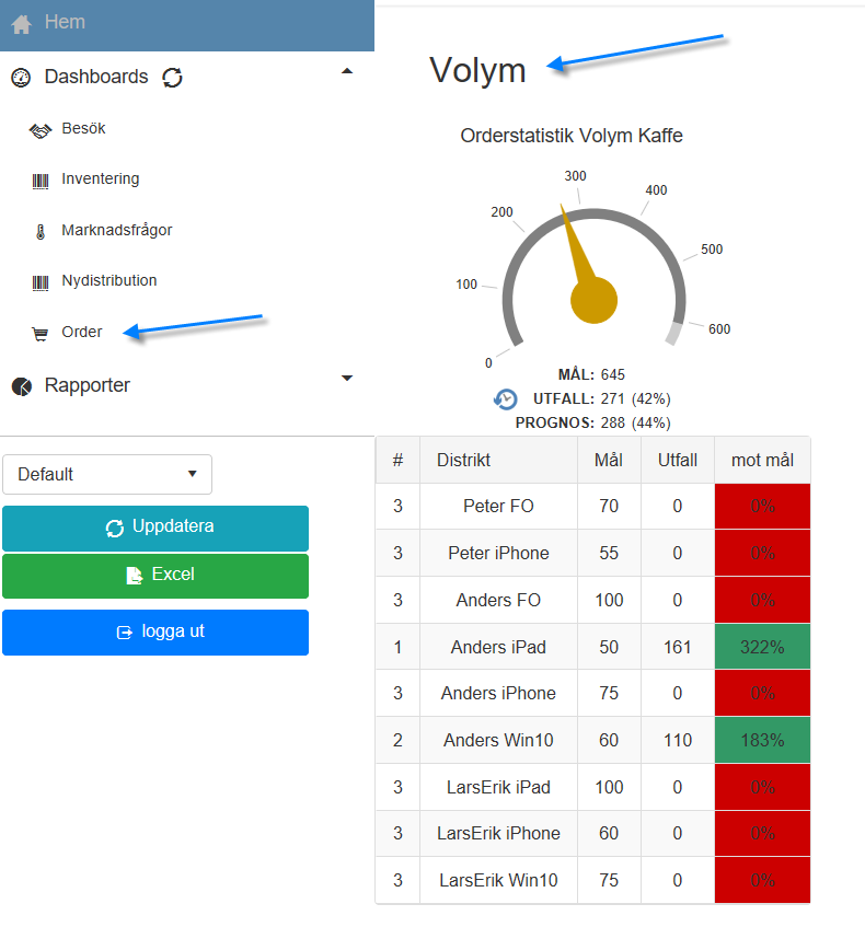 Om du bockar i att du vill se detaljer så får du fram utfallet och målet per säljare enligt bild ovan.