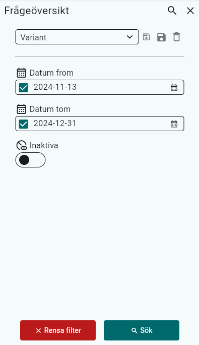 Vill du endast ta med aktiva frågor ska Inaktiva pricken vara svart, är den vit tar den även med Inaktiva frågor.