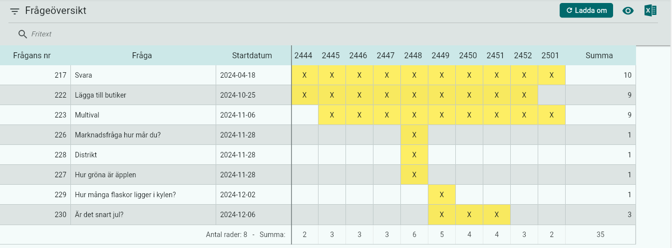 Längst ner ser ni hur många frågor som är aktiva under den veckan.