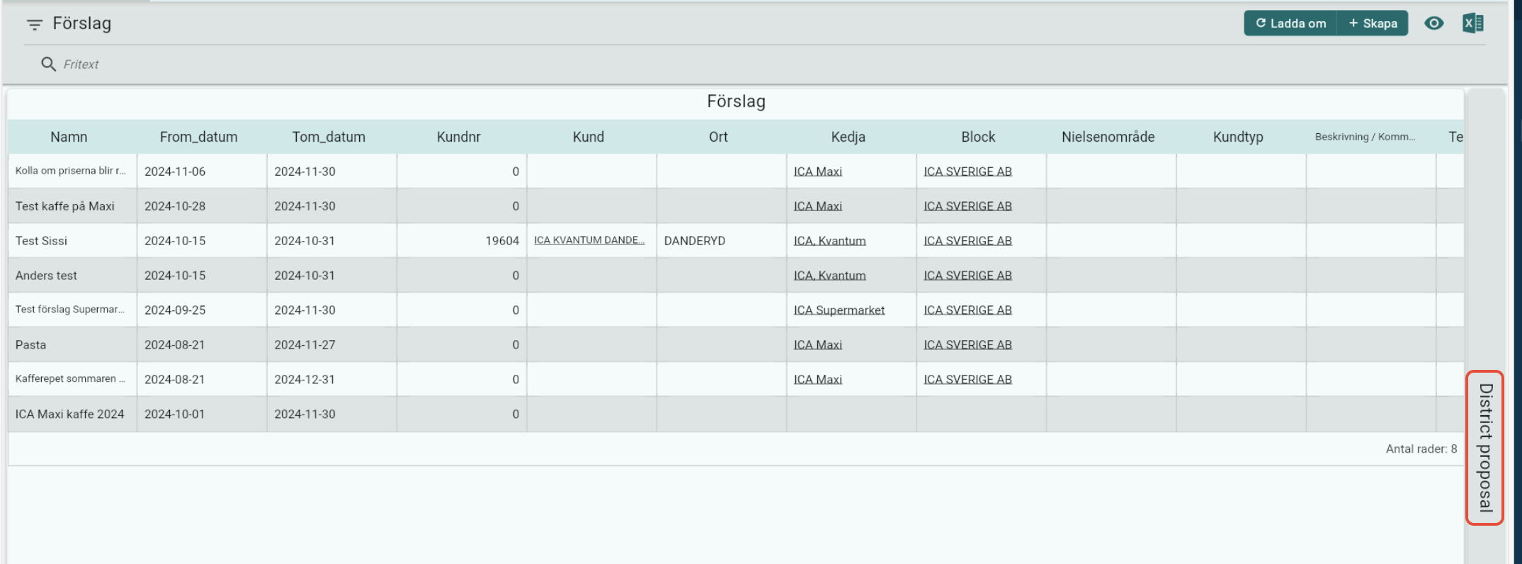 Klicka på "District proposal" för att se förslag skapade av Säljare.