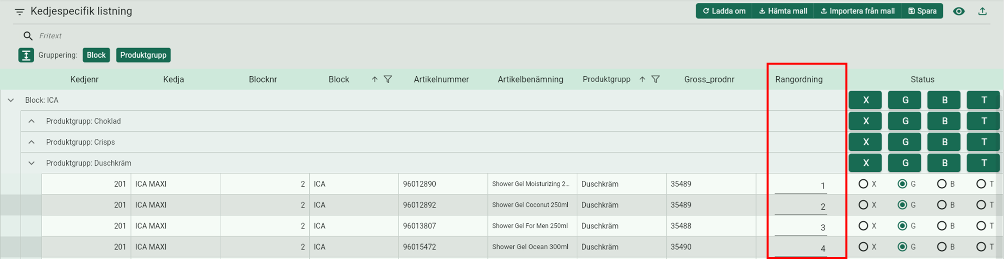 I nedan vy kan du rangordna artiklarna på kedjenivå, vilket innebär att rangordningen kan vara olika mellan kedjor. Det går också att rangordna artiklarna på respektive artikelkort och gäller då alla kedjor.