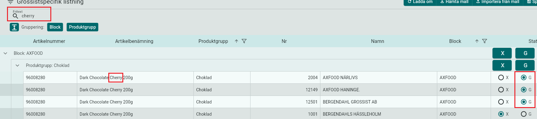 Syftet med funktionen Grossistspecifik listning / sortiment är att kunna ange vilken listningsstatus artikeln har på en specifik Grossist. Förutom att ange listningsstatus direkt i funktionen går det även att importera en korrekt listningsstatus via en excelfil.