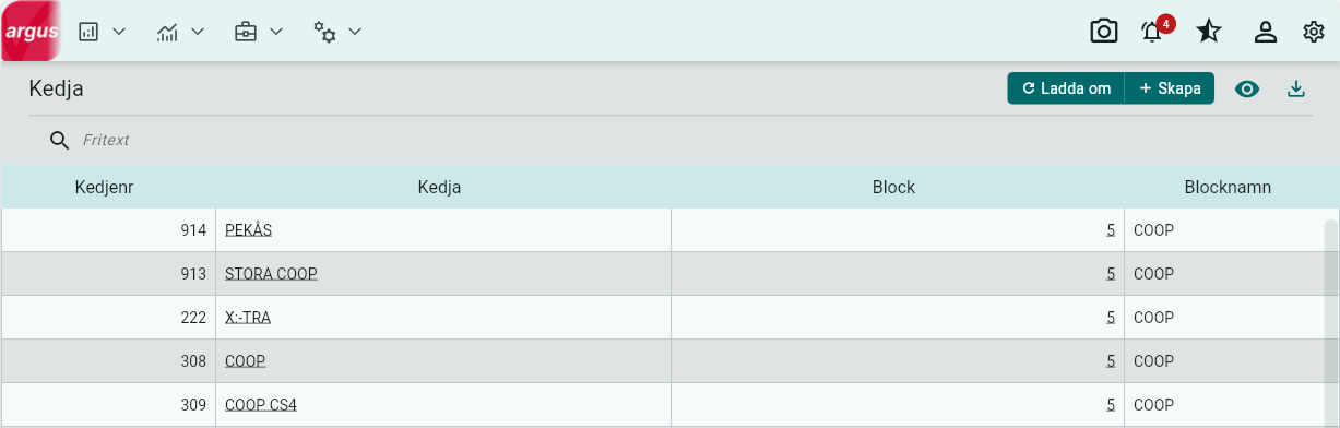 Klickar du på en Kedja kan du se vilka kunder som är kopplade till kedjan