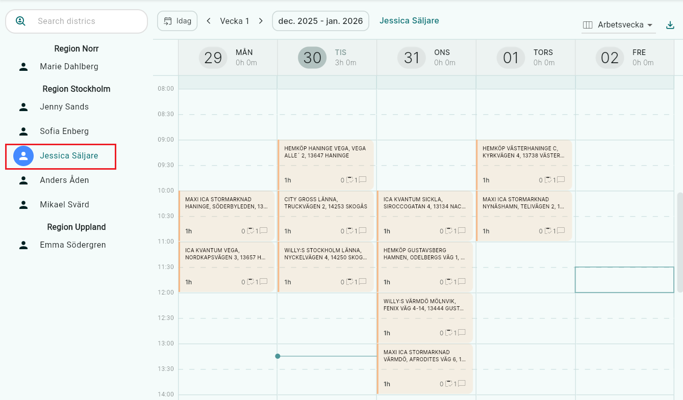 Under Administration - Distrikt - Distriktskalender kan du se hur en säljares planering ser ut.