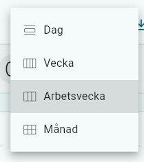 Du kan välja mellan vyn: Dag, Vecka, Arbetsvecka och Månad.