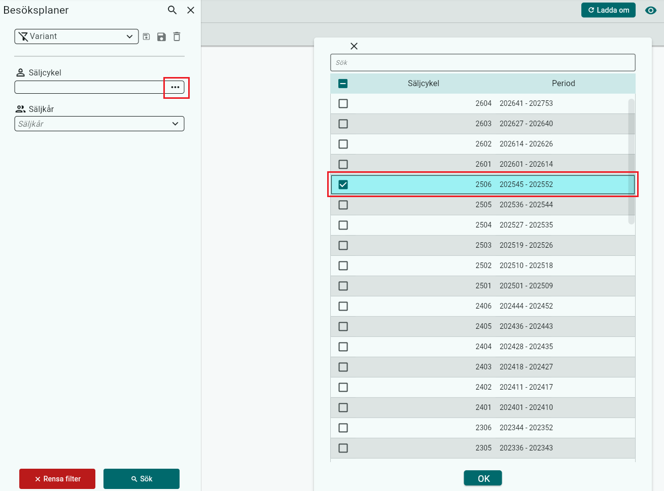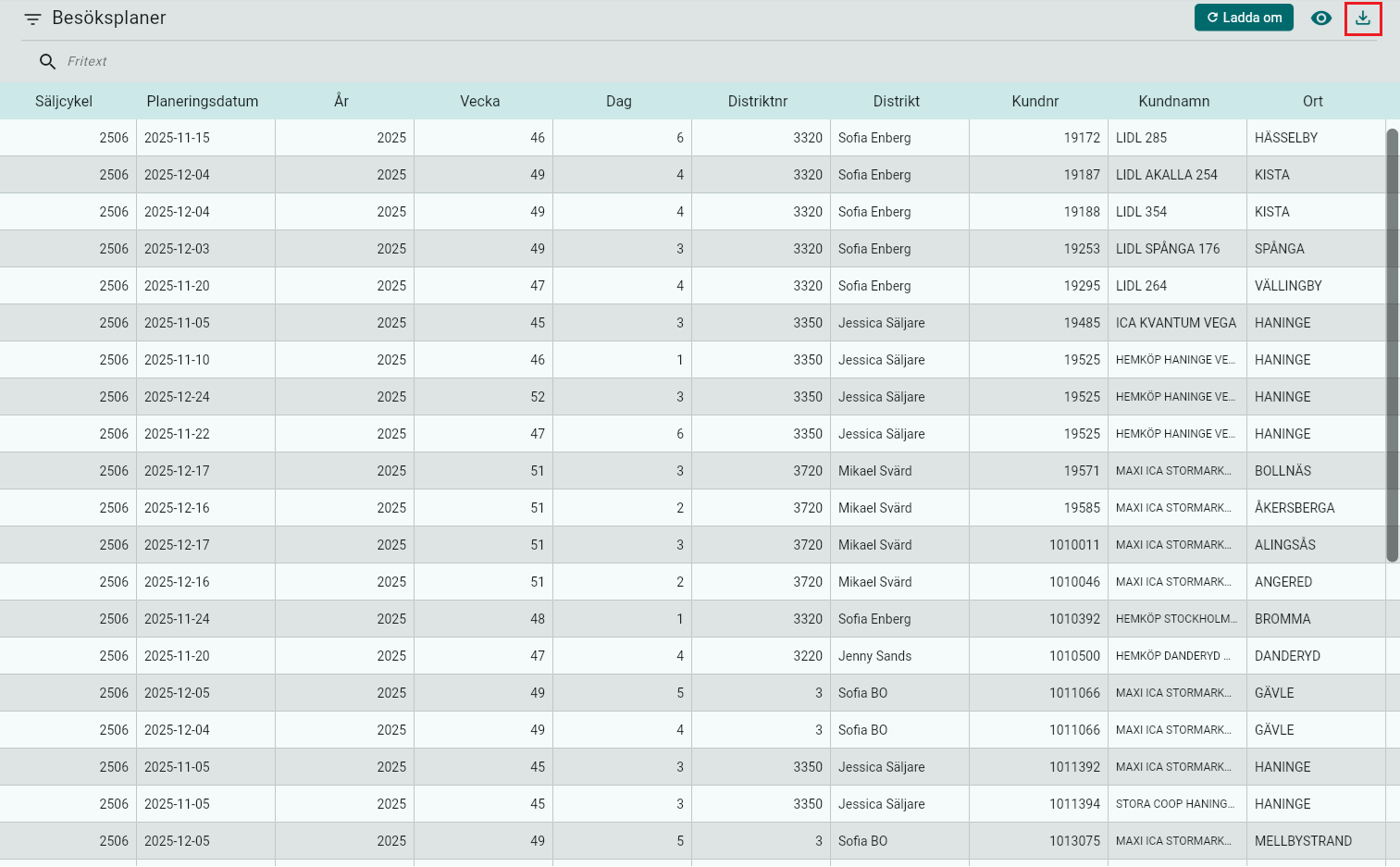 Här kan du se alla besök som ligger planerade under vald säljcykel.