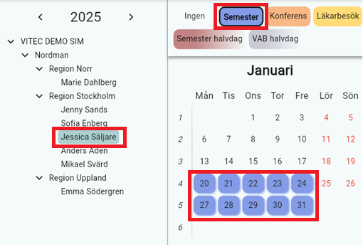Vill du endast lägga till frånvaroorsak på en säljare; tryck på namnet i vänster spalt, klicka på orsaken, t.ex. Semester och märk dagarna det gäller genom att klicka på dem. Då sparas detta på endast den specifika personen.