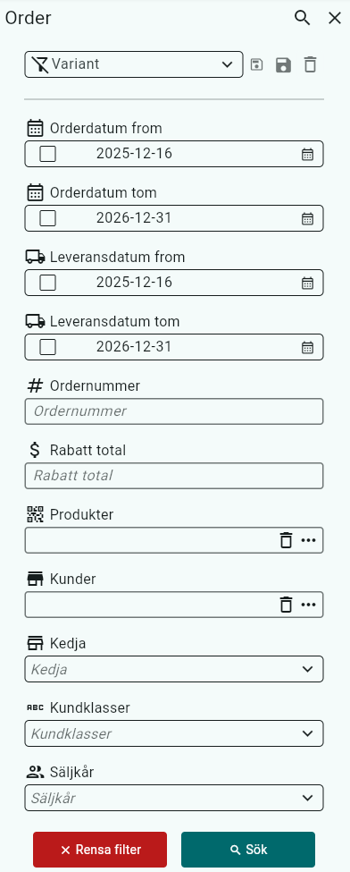 Vill du spara dina angivna sökparametrar för att kunna använda de igen kan du spara en variant.