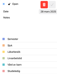 - Välj anledning till frånvaro utifrån listan som dyker upp