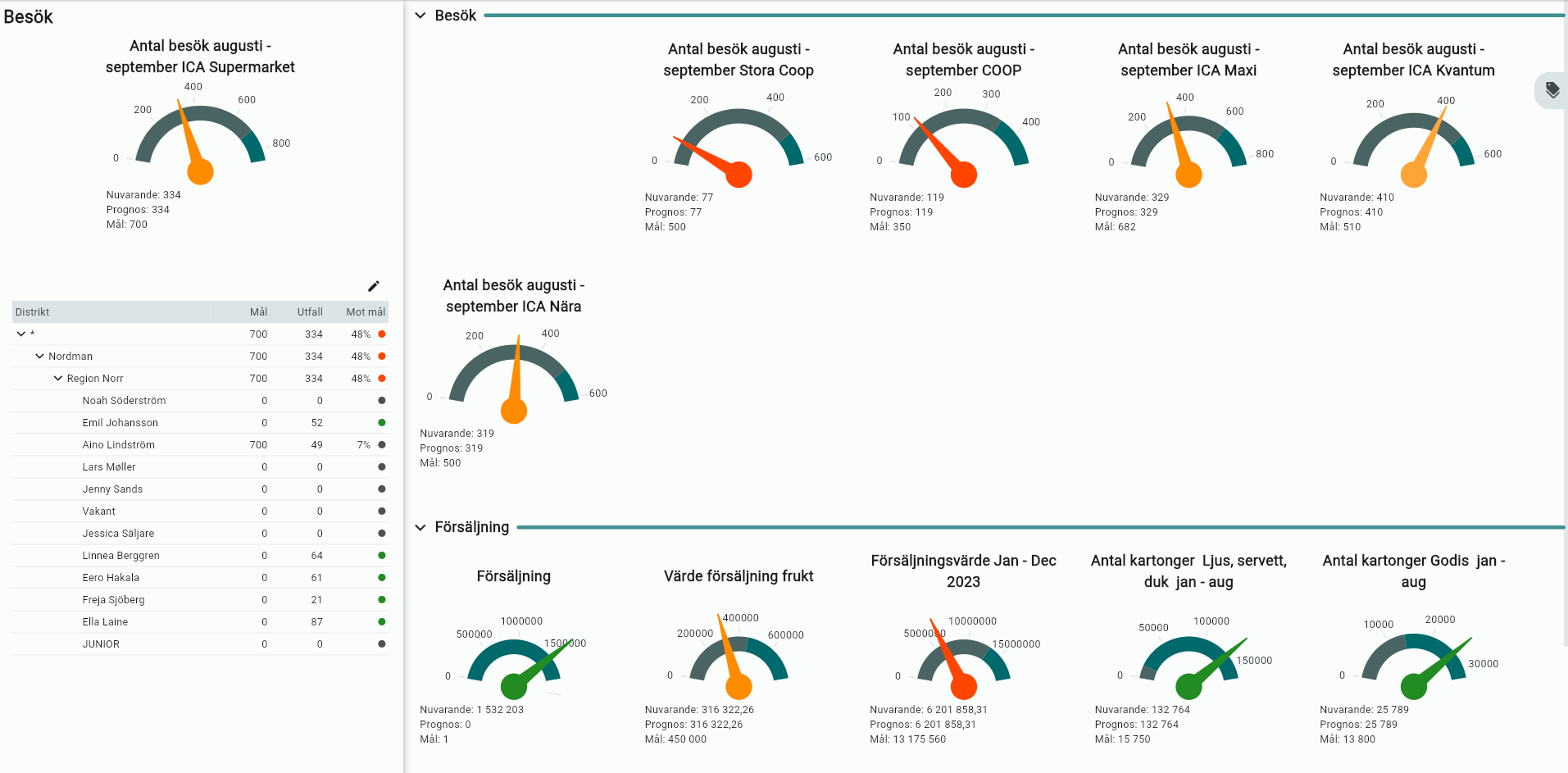 •Besökta kunder - Visar antal besök som är gjorda av den totala besökskvoten (Antal kunder x angiven besöksfrekvens.