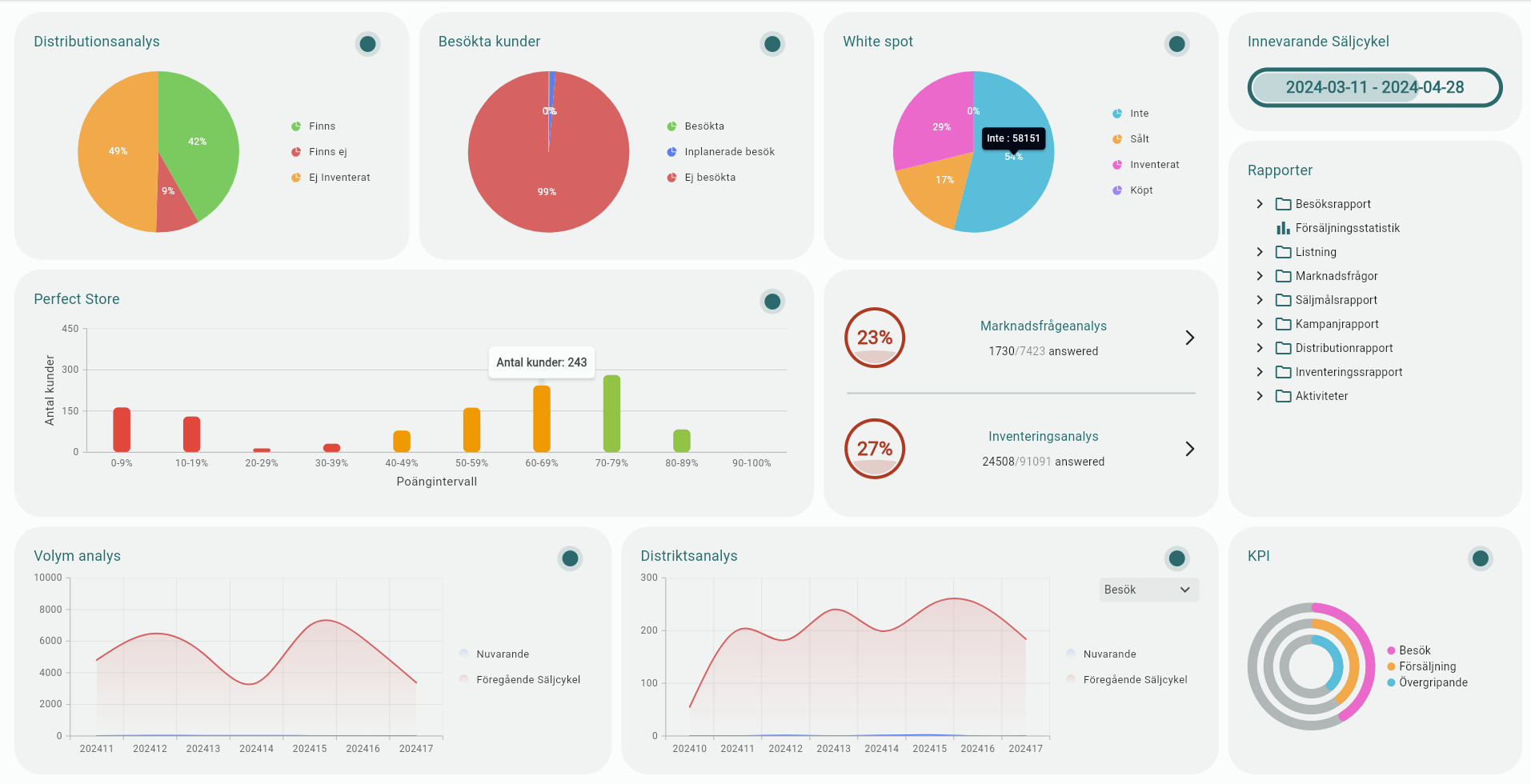 •Distriktsanalys - Kan filtreras på besök eller order och jämförs mot förgående säljcykel.