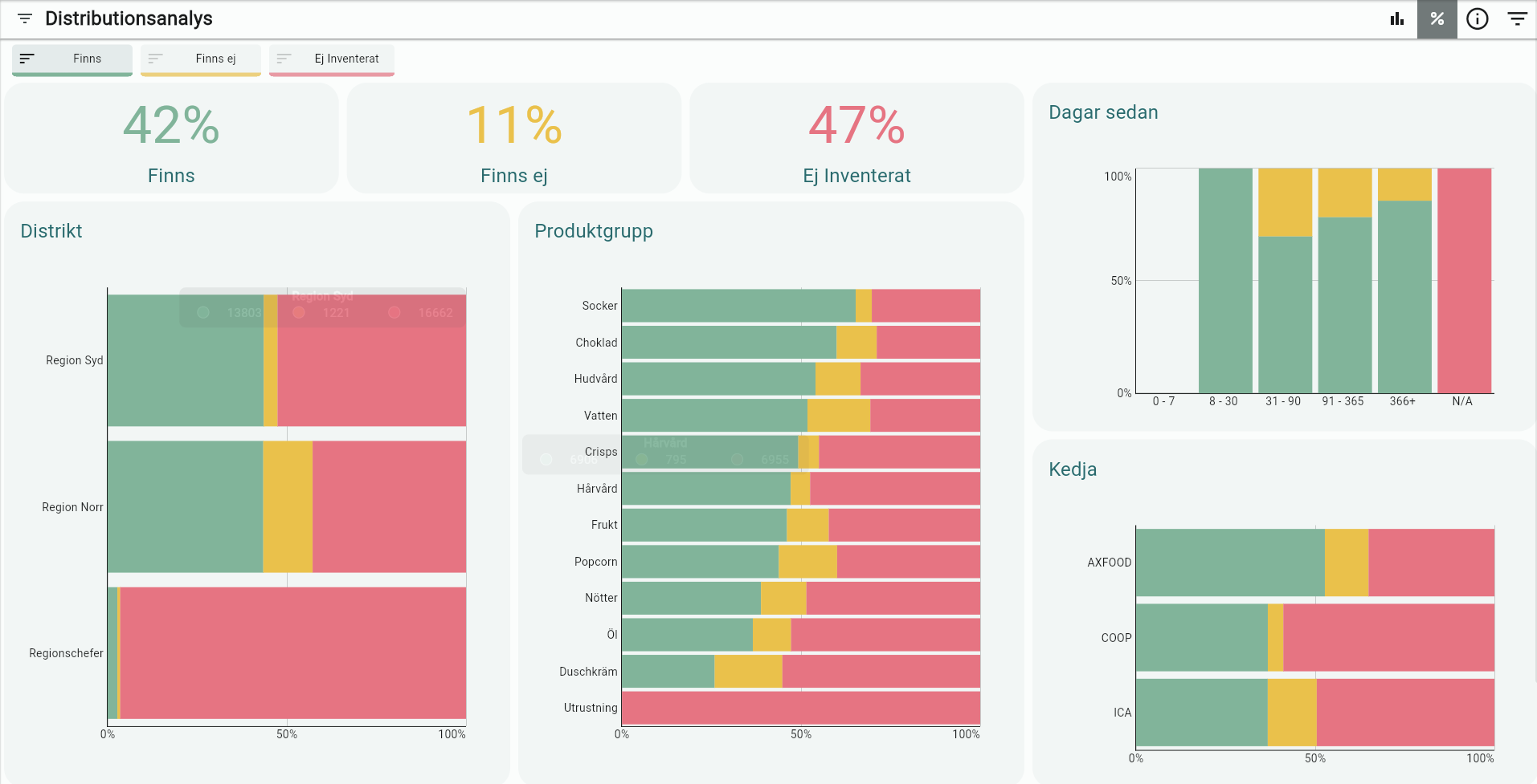 Rapporten är uppdelad utifrån Region, Produktgrupp och kedja samt utifrån hur länge sedan inventeringen har registretats.
