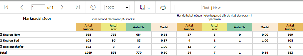 Antal Ja per Region/Distrikt. (Är det en antalsfråga visas Totalsumma per Region/Distrikt, Fotomarknadsfråga visas antal bilder tagna per Region/Distrikt).