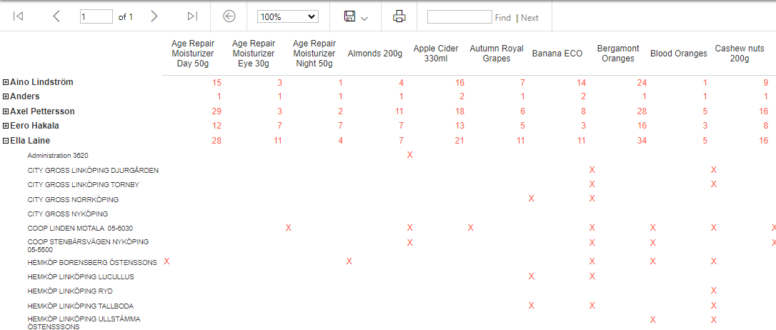 Öppnar man upp distriktet ser man vilka butiker som saknar registrerad listning på produkten. (X)
