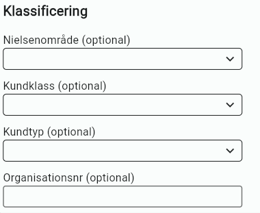 Under klassificering kan du ange Nielsenområde, Kundklass, Kundtyp, Organisationsnummer.