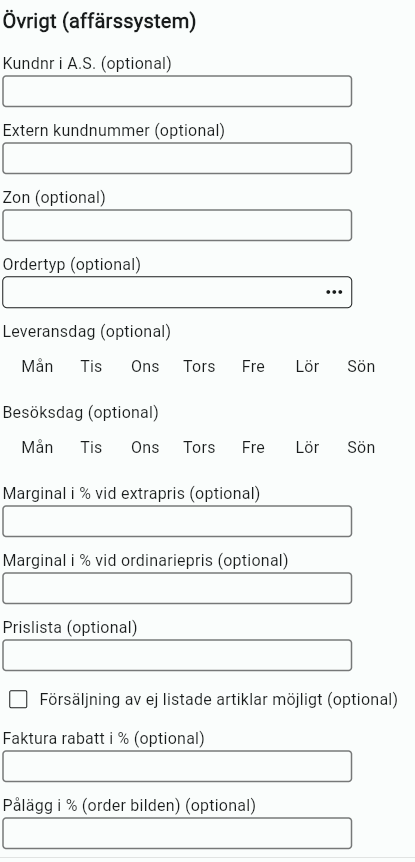 Under fliken övrigt kan du ange eventuellt kundnummer i Affärssystem, extern kundnummer.