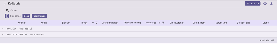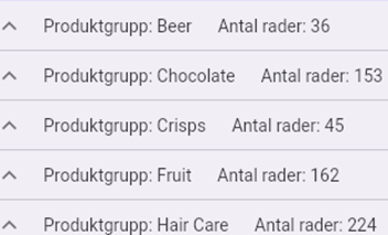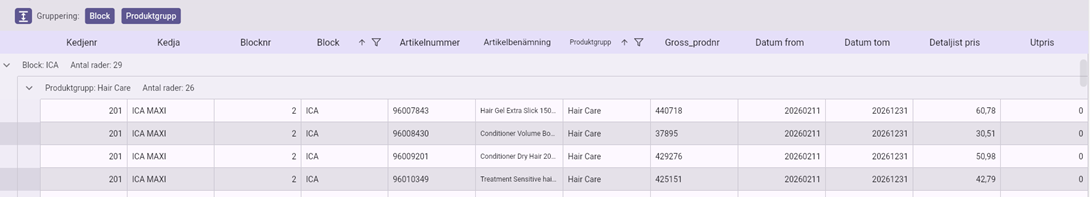 När Block avmarkeras i grupperingen visas produktgrupperna samt antal rader.