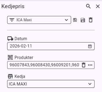 Du kan göra urval på artiklar och kedjor genom att klicka på de tre strecken till vänster om texten kedjepris.